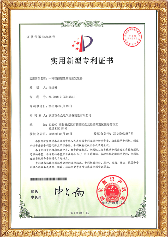 程控超低頻高壓發生器專利證書