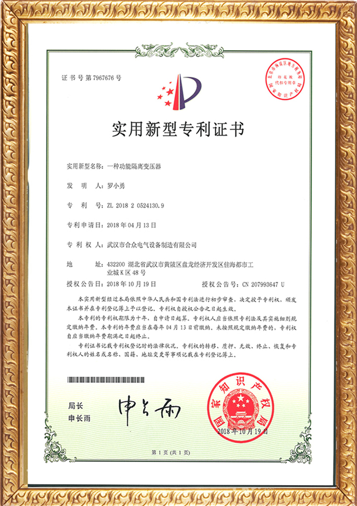 功能隔離變壓器專利證書