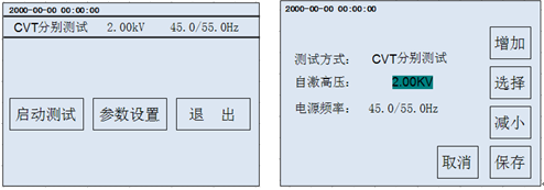 首先根據(jù)相應(yīng)的接線提示接好儀器外部的連線,然后點擊主界面“CVT測試”選項,進(jìn)入下一級CVT測試菜單(如圖5-5)。然后可以點擊“參數(shù)設(shè)置”進(jìn)去設(shè)置菜單(如圖5-5)進(jìn)行詳細(xì)的測試參數(shù)設(shè)置。分別點擊每個需要設(shè)置的項目,按“增加”“減小”或“選擇”來修改。修改完成后點擊“保存”即可保存剛才所修改的參數(shù)并返回CVT測試界面,點擊“取消”則不保存本次修改并返回CVT測試界面。