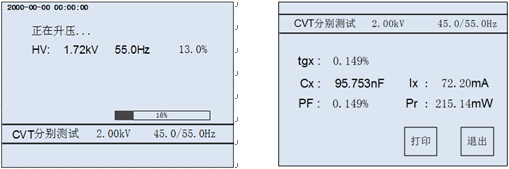 相關(guān)參數(shù)設(shè)置好了后長按“啟動測試”單,進(jìn)入測試菜單(如圖5-7)。測試過程中電壓值一項是根據(jù)先前所選擇的測試電壓平滑至設(shè)置值后保持不變,然后自動開始測試。開始測試后根據(jù)先前所選擇的干擾頻率自動變頻到相應(yīng)的頻率進(jìn)行測試,測試完成后自動顯示測試結(jié)果(如圖5-7)。測試結(jié)果自動保存,可點擊“打印”按鈕打印本次測試結(jié)果。