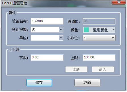各個通道的參數可在設備管理區域內,選擇相應的通道點擊鼠標右鍵設備屬性進行設置。如下圖2-13通道屬性設置,在此窗口內可設置通道名稱,禁止報警,顯示顏色,通道單位,顯示小數位數等,并能夠向下位機讀取或者寫入通道的下限和上限等操作。