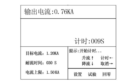 按上,輸出電流將不斷上升,松開就停止升流,如果到上限就提示滿量程;按下↓,輸出電流將不斷下降,松開就停止降流,如果到下限就提示已回零;按計(jì)時(shí)一,計(jì)時(shí)開始工作,到耐流時(shí)間計(jì)時(shí)結(jié)束完成試驗(yàn);