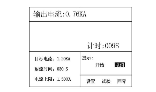 按上方法切換到“開始”確定后進(jìn)行試驗(yàn),與手動(dòng)升流試驗(yàn)不同之處就是升流過程將自動(dòng)升到“目標(biāo)電流”值,然后啟動(dòng)進(jìn)行計(jì)時(shí)。升流過程為逼近方式,首先快速升到接近目標(biāo)電流值,然后再進(jìn)行微調(diào),保證輸出電流幾乎為目標(biāo)電流值。
