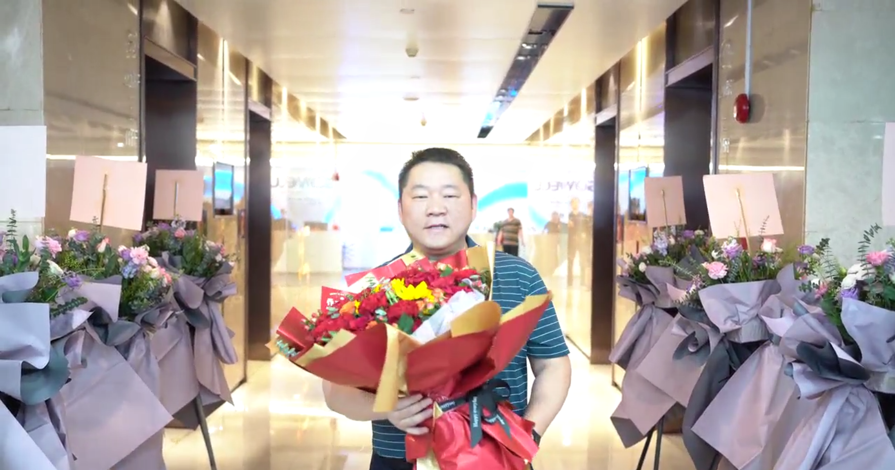 led all the staff to send blessings, wishing the company a good luck for the housewarming and a long rainbow