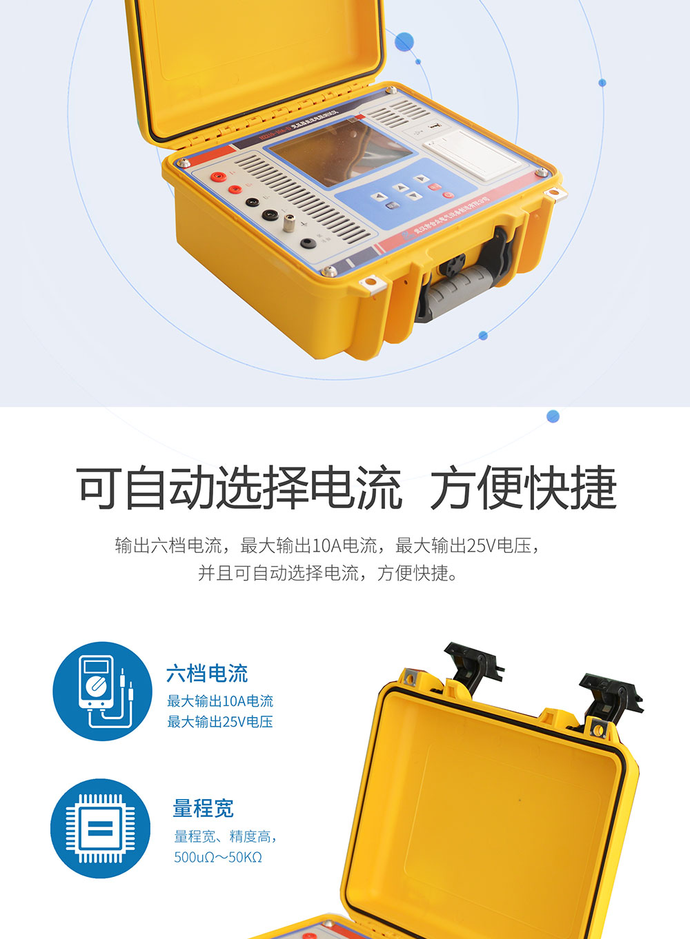 1、鋰電池供電或者220V交流供電自適應(yīng),一次充電,可連續(xù)進(jìn)行上百臺變壓器直流電阻測試,測試過程簡單、方便。