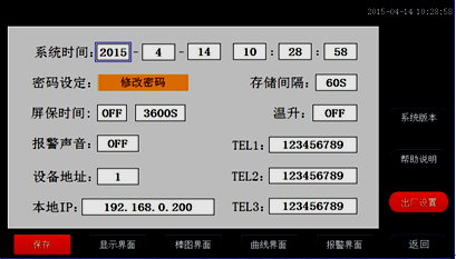 系統參數設置包括:日期、記錄間隔、密碼設定、網口通訊IP設定、蜂鳴器報警、溫升、屏保、設備地址。