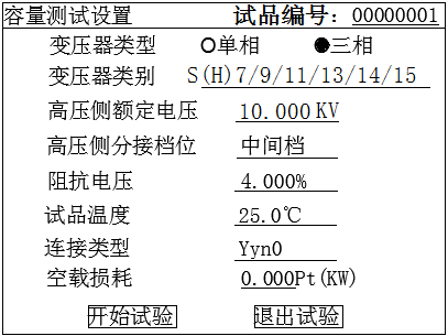 變壓器類別:設置變壓器類別,光標停留在高壓側額定電壓位置按“OK”鍵然后按“↑”“↓”“←”“→”其值可以為標S(H)7/9/11/13/14/15、100℃干式變SCB9/10/11/12、120℃干式變SCB9/10/11/12、145℃干式變SCB9/10/11/12,再按OK即完成設置。